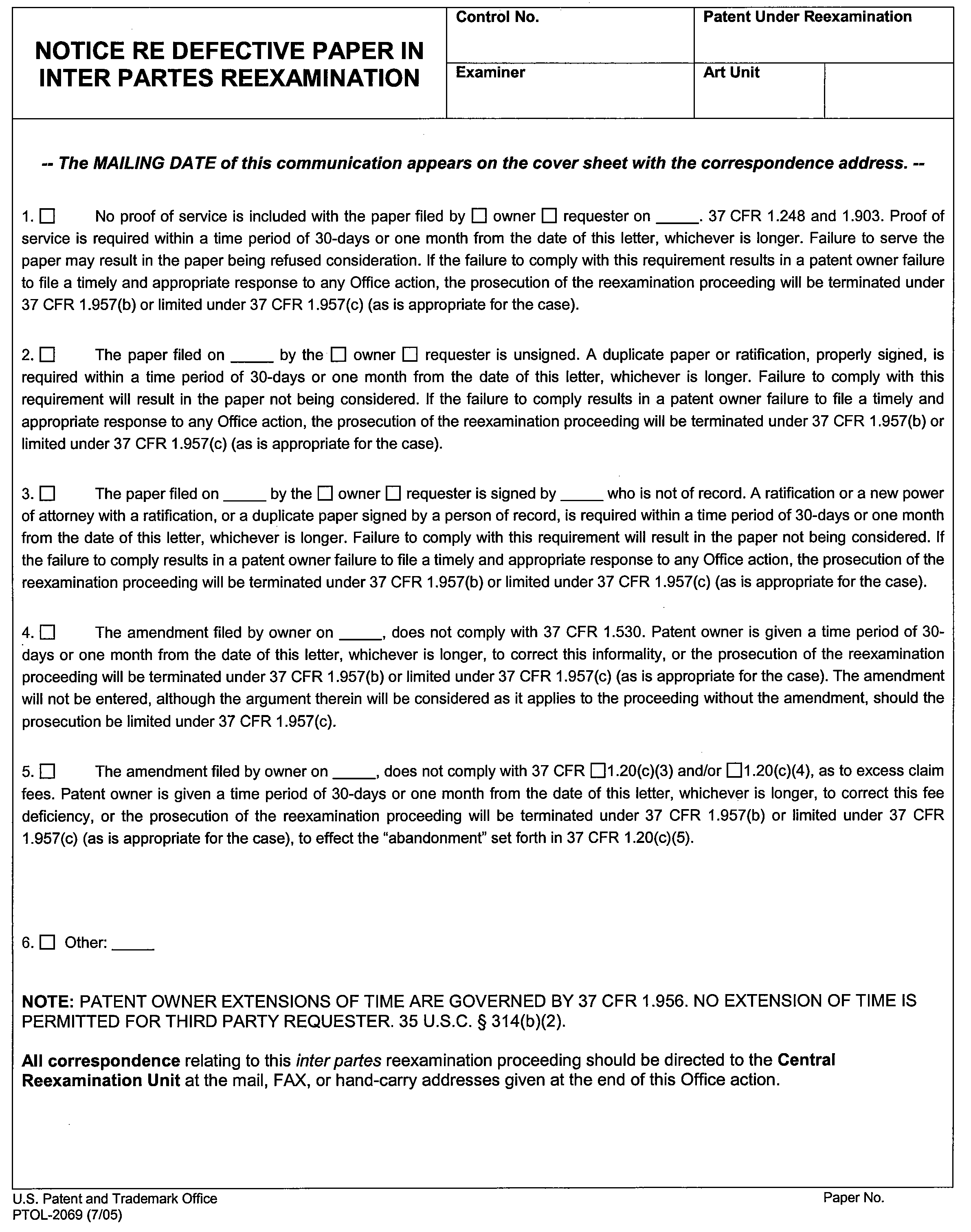 Where a submission made is defective (informal), form PTOL-2069 is used to provide notification of the defects present in the submission. Form PTOL-2069 is reproduced below. In many cases, it is only necessary to check the appropriate box on the form and fill in the blanks. However, if the defect denoted by one of the entries on form PTOL-2069 needs further clarification (such as the specifics of why the amendment does not comply with 37 CFR 1.530(d)-(j)), the additional information should be set forth on a separate sheet of paper which is then attached to the form PTOL-2069.